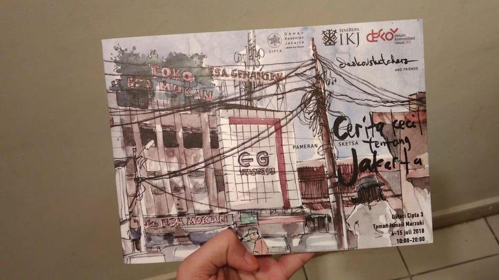 Pada kamis, 5 juli 2018, hari ketiga saya di Jakarta, saya di beri undangan untuk menghadiri pembukaan pameran sketsa di Galeri Cipta 3 Taman Ismail Maszuki pukul 19.00. Setelah sambutan dan galeri mulai dibuka, saya bergegas ke meja tamu untuk mendapatkan katalog, setelah itu barulah saya menyerbu masuk galeri untuk tau seperti apa karya-karya yang dipajang di sana.