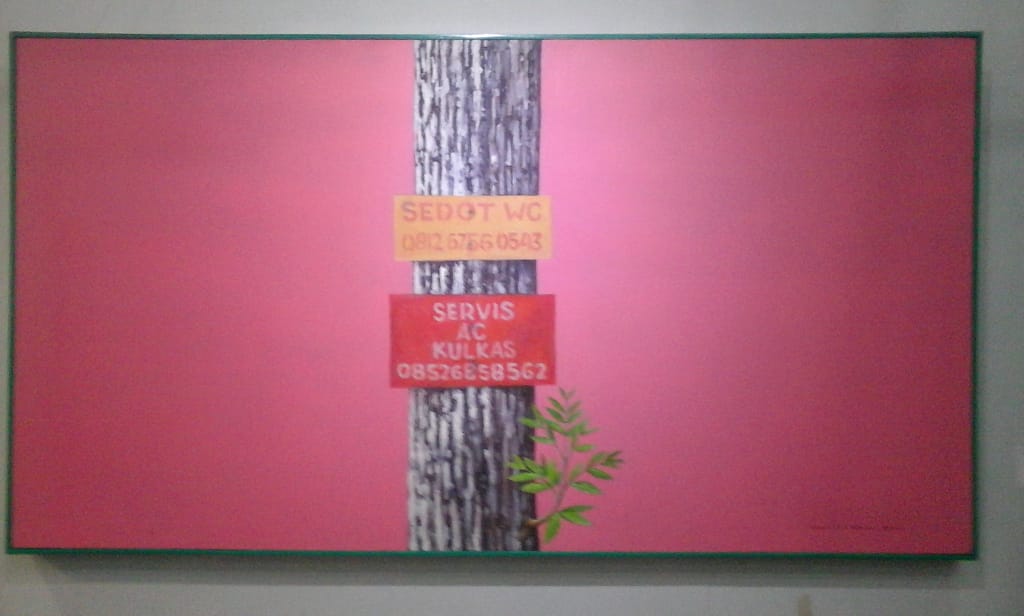 Background pink mentereng, batang pohon dengan iklan sedot wc dan seranting dedaunan, lukisan ini memanjang mendominasi bidang dinding. Salah satu karya yang terpajang dalam pameran Matrilini di Taman Budaya Sumatera Barat ini awalnya tidak begitu menarik perhatian saya – tidak sebelum saya mengeja nama Syahrial Yayan di bawahnya. “Wah, begini ya lukisan realis Syahrial Yayan?” pikir saya. Tiga bulan yang lalu karya beliau terpajang di galeri yang sama pada pameran Tambo dari komunitas Kampuang Sakato. Ada tulisan-tulisan dan tumbuhan dalam pot yang terkesan naif, begitu saya mengenali lukisan-lukisan beliau. Kali ini hadir dengan warna yang ceria menantang dan pendekatan realis.
